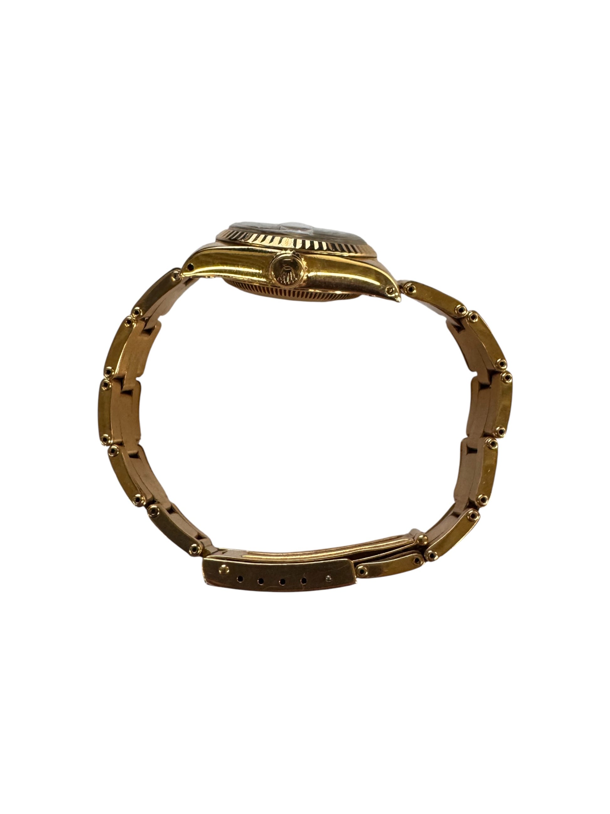 26mm Rolex 18K Yellow Gold Oyster Perpetual Lady-Datejust. Black Dial with Stick Hour Markers. 18K Yellow Gold Fluted Bezel. 18K Yellow Gold Oyster Band. Style 6917. Circa 1981. Small mark in the crystal near the 10 o'clock hand.