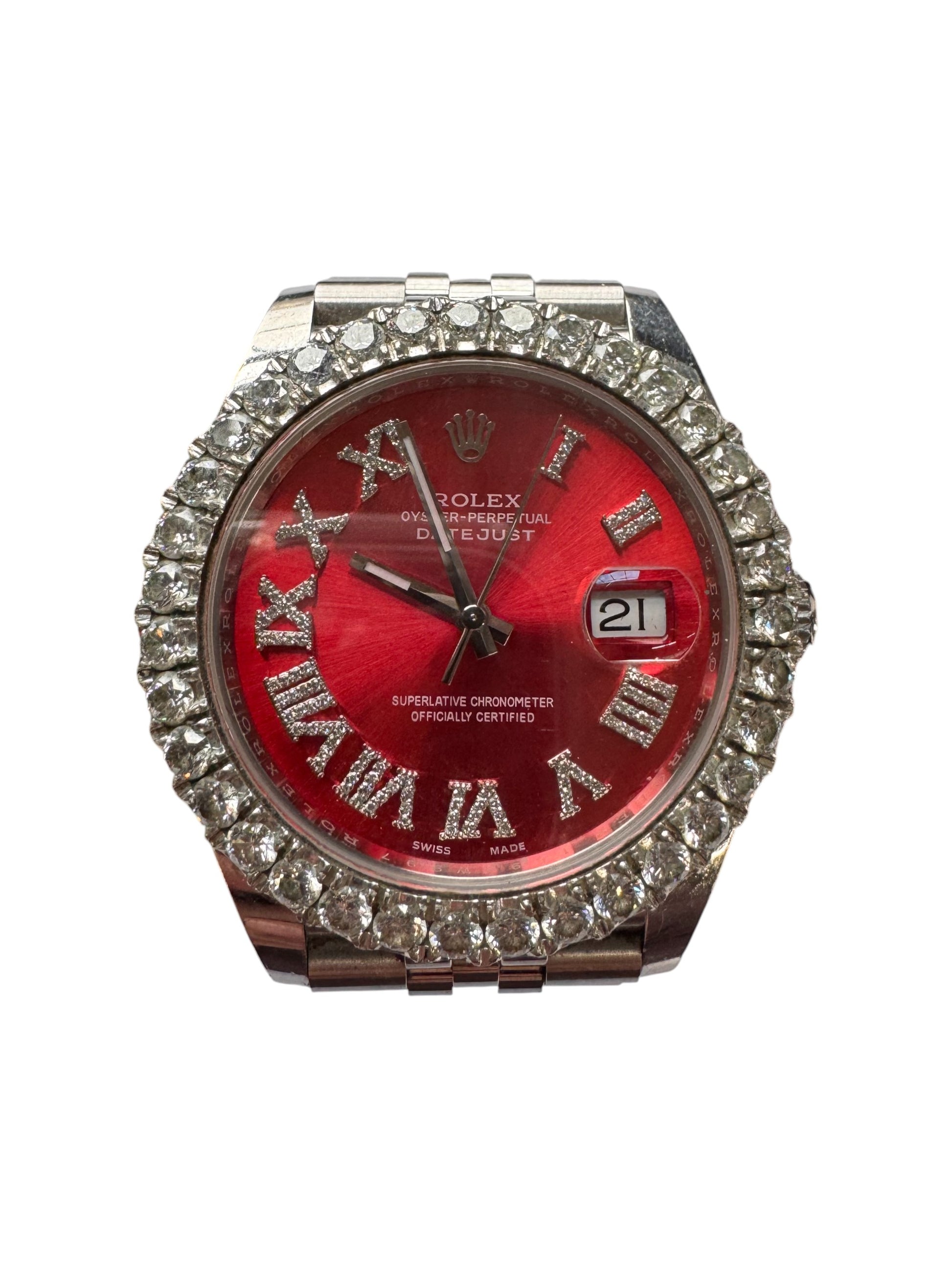 41mm Rolex Stainless Steel Oyster Perpetual Datejust 2020. Aftermarket Red Dial with Diamond Roman Numeral Hour Markers. Aftermarket Diamond Bezel. Real S1-VS Diamonds. Stainless Steel Jubilee Band. Style 126300.